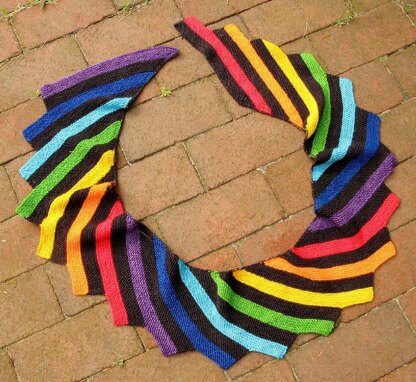 Mighty Mini is worked flat. Regular increases at one edge and staggered decreases at the other edge create the teeth-on-the-bias shape. The main color is carried along the smooth edge, and the mini ends are woven in as you go.