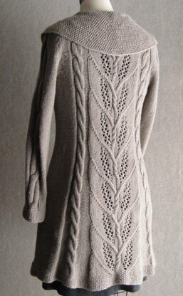 A real head turner! I just loved combining cables and lace in this long jacket. Seed stitch (moss stitch if you're across the pond) wraps around the bottom, curves up along the front and around the fabulous shawl collar. Construction is straightfoward and from the bottom, and the collar is a continuation of the front edge, shaped with short rows. Lots of nifty cable techniques.