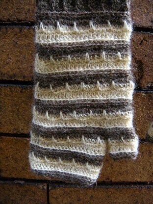 There is something special about working with a rare breed yarn like Leicester Longwool. When I saw the laceweight that Ross Farm had in their booth, I could not resist it. The resulting fabric is even nicer that I expected and is surprisingly soft given how rustic it looks. But if you are not one to wear rustic wool on your wrists, I'm hard pressed to imagine any laceweight yarn that wouldn't work well with this pattern. The alpaca version is super soft and warm, without being heavy. The color changes and textured stitches keep the project interesting, but the stitch pattern is not complex