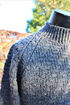 Milter is a sweater/pullover knitted from the bottom edge and up with a textured all over pattern. The sweater has a raglan yoke, long sleeves and rib edges with a mock turtle neck. The pattern is made for at yarn with a gauge of 22 stitches per 10 centimeters (textured pattern) i.e. a yardage of approimately 90 meters per 50 grams.