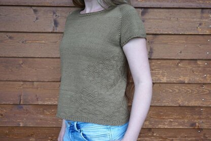 The Mina Shirt is knitted from top to down with raglan increases. On the left side of the shirt grows a simple eyecatching flower pattern worked in knits and purls. The shirt is intended to be worn with approx. 10cm 4’’ positive ease. The Sample is shown in Size S on an 86cm 33.8’’bust