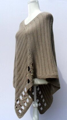 Make this sharp, stylish poncho designed as a solid fabric for warmth using flexible materials and stitching to hug the shoulders for comfort. This design features the Linked Treble Crochet Stitch which is made by connecting Treble Crochet stitches together to form rows of dense ribbed-like cozy fabric. The openwork section features the Linked Treble Crochet stitch, wooden beads and Cobble stitches.