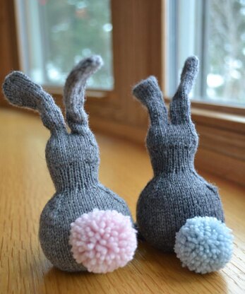 The gray samples are knit in Quince & Co. Finch in the Kumlien’s Gull, and Kittywake colorways. The pom-pom tails are in Quince & Co. Chickadee in the Dogwood and Glacier colorways.