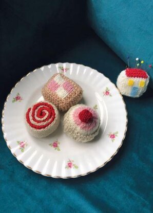 Three mini cakes: cupcake, Battenberg slice and Swiss roll slice, and a mini house. The patterns are simple and would be fine for a beginner who can do simple intarsia for the Battenberg slice and increases by make one stitch. These are stuffed with toy stuffing. any DK weight yarn can be used and these are a good way to use up small amounts of yarn. Photos Knitting magazine.