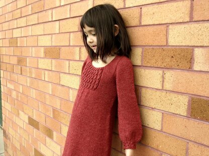 This dress is knitted in one piece from the top-down, using amazing Contiguous sleeve method developed by [Susie Myers][1]. Also, there are many techniques in this pattern, such as Slipped Stitch Edge, a unique way to make gathers at chest, and Eyelet Rib Lace stitch at front panel, bottom border and cuffs, whose stitch is made by combinations of yarn over (yo) and knit 2 stitches together (k2tog), which create holes on texture and they look like caviar to me! So easy and comfy to wear, your girl will look pretty in it!