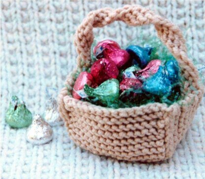 Use up your scrap yarns! Knit these up in a jiffy, for party favors! Or place one basket by each dinner place setting with after dinner mints! Give away at your next knitting guild meeting with small treats inside! Fast and fun to knit! Use up small amounts of worsted weight yarns, and knitting needles, US # 9. Finished basket is about 5 inches high with handle, and 4 across top of basket.