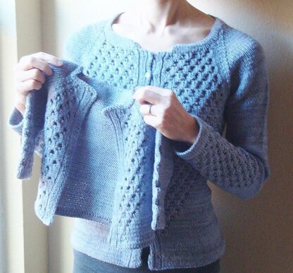 The front and the sleeves are decorated by an open lace, which forms a unique diamond shape. The folded hems add elegant details to this beautifully tailored cardigan.