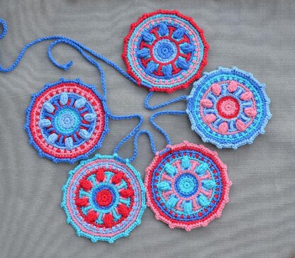 This mini mandala garland is ideal as a wall decoration, but separate mandalas can also be used as an applique for a pillow cover, bag, curtains and even clothes!