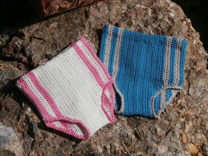 Crochet baby knickers look so cute over nappies. Worked from centre front and joined at side seams by 1 row dc. Clear instructions given.