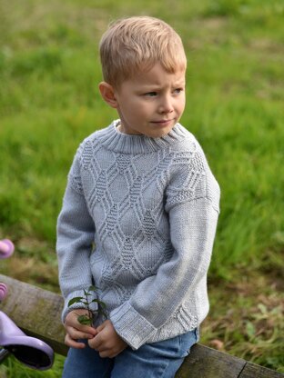 This comfortable oversized sweater is knitted bottom up on straight needles. The design features are dropped shoulder, boxy silhouette and round collar. The children pattern comes with instructions for both - sweater with textured front only and sweater with textured stitch all over. Knitting pattern is written with charts for all sizes and detailed row-by-row instructions.