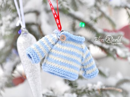 The sweater is knitting flat on two needles in pieces and later seamed. The finished size is approximately 2 inches (5 cm) high. This is a quick and easy project. The Mini Sweater can be an original gift for Christmas.