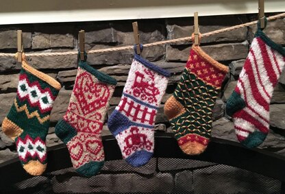 This is the third set in a series of miniature stocking patterns. The designs in this set include a bargello style stocking, hearts, a train engine with his caboose, a Fabregé egg style and a candy cane.