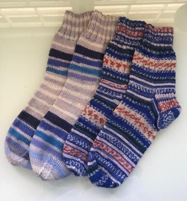 These socks are designed to showcase the yarn and therefore, keep stitch textures (sockitecture) to a minimum. They feature classic ribbing, a shorter leg, flap and gusset heel shaping and a grafted toe. The leg and foot are in stockinette, so this pattern promises to quickly pick up a great rhythm and fly off the needles in no time.