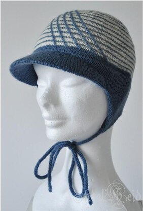 Variation of Miki cap for smaller children, now with ear flaps and cords to lace up with. Knitted, supported visor and a simple diagonal striping made with lifted stitches. The ear flaps have a windproof lining to help to prevent ear aces.