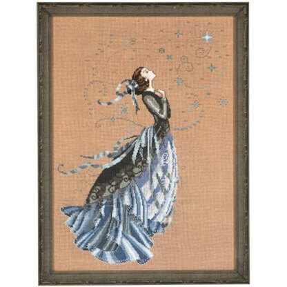 White glowing stars reflect over a gown of satin ribbons and brocade. The dress is stitched in soft greys and dusty blues and covered in swirling starry beads. As the lady watches the sky filled with luminous diamonds she wishes upon them all. Dreams placed on a star really can come true.