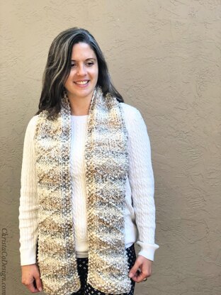 The Miramonte is a chunky knit scarf pattern featuring a simple diamond design. This scarf is an easy knit and works up quickly in super bulky yarn.