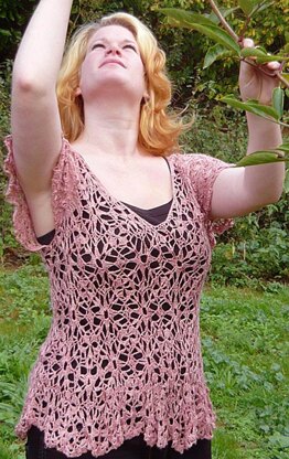 Miranda is a loose fitting lacy summer top which is intended to be worn over a camisole. It is made using block motifs –square and a triangle.
