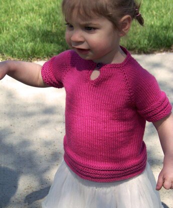 Warmer days bring a need for something a little lighter. This little top, knit up in a lightweight cotton blend, is the perfect thing for warmer weather. Cute little touches like the keyhole opening on the neck and the garter band accents to the arms and hem add interest to this top down raglan without adding much difficulty.