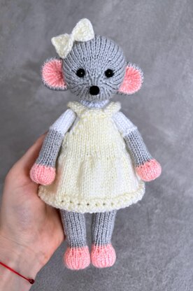 This is a pattern for knitting a stuffed toy mouse. The head, skirt and small ribbon are knitted flat (back and forth). The body, legs and arms are knitted in the round on double-pointed needles, and the legs and body are worked in one piece.