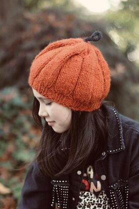Thick and quick week-end project, this cute pumpkin hat is ready to add some playfulness to your fall decor! Worked bottom-up and in the round, it is crowned with cables to add some volume and an I-cord stem on the top.