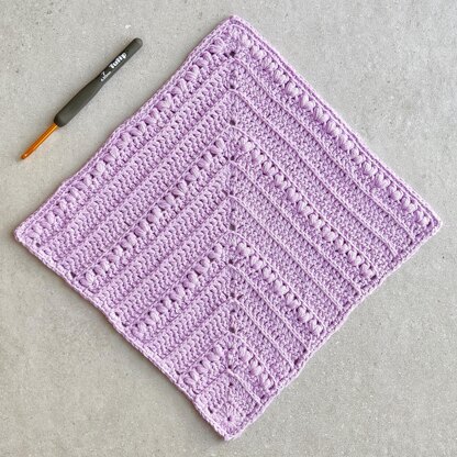This beautiful square is worked in a crochet mitered method from corner to corner (without a need to decrease). The addition of little tulip-like flowers gives the square a lovely floral theme and a romantic look.