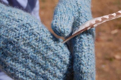 About the thumb & construction This mitten is knit bottom up in the round. The thumb is a variation on a standard thumb that creates a “goreless” effect for minimal interruption to the pattern (i.e. the increases are not visible on the back of hand and,in fact, travel up the thumb itself). The effect is to create a slightly biased fabric on the thumb that also mimics the jointed shape of the thumb for an anatomically correct shape.