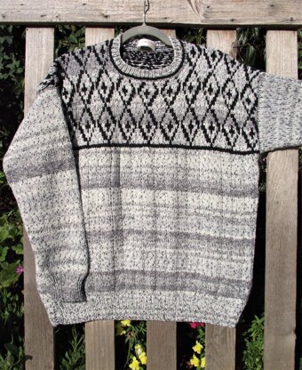 This design uses lovely toning shades for the background and a stand-out contrast for the colour-work yoke. The main part of the back and front is worked in a broken rib pattern. The neckband and base of the yoke have a bold narrow “border” of the contrast colour, which gives a neat and smart highlight to the design.