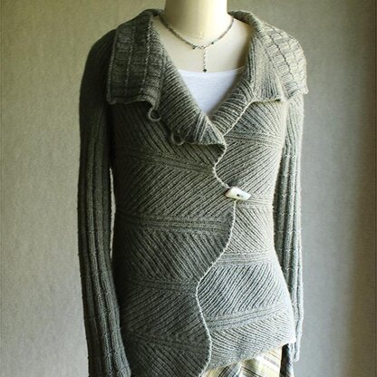 Mixed Media is knit from side to side in one piece, with short rows and decreases shaping sleeve caps. Sleeves and collar are picked up and knitted. The only seams are along shoulders and down inside of sleeves.