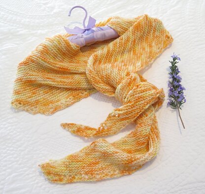 The sample scarf measures 66 cm / 26½ inches, by 158 cm / 62 inches, by 214 cm / 85 inches after blocking.