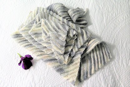 Designed in a boomerang shape this scarf is a very simple four-row pattern – one of the rows is easy but slow to do, another is a purl row and the remaining two are knit rows.
