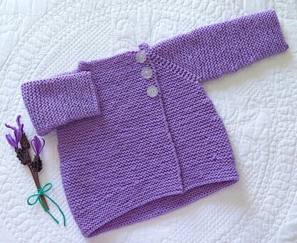 This seamless baby cardigan is made top-down with integrated neck and button bands and is all about shape and style. It has a very simple mandarin-inspired collar and offset button closing. The body has a cocoon silhouette, flaring slightly and ending with a beautiful asymmetrical curved hem. Simple garter stitch, no flourishes, but a stylish shape with a bit of a vintage flavour.