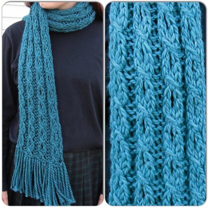 Mock cables make this an elegant looking scarf, while eyelets reduce bulk and give it a soft drape. The stitch pattern is easy to memorize and requires no cable needle. Knit on large needles with bulky yarn, you, or someone you love, will be wearing this scarf in no time!