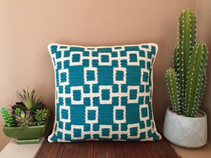 Bring a mid-century modern feel to your living room or bedroom with this eye-catching, 18-inch square pillow pattern. Use a simple two-color, 22-stitch motif repeat to create an interlocking squares pattern. Both colors of yarn are carried throughout the work, making color changes easy with only two ends to weave in.