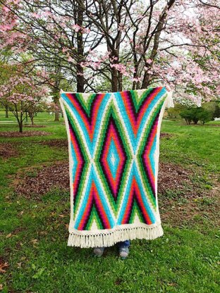 Pattern pdf includes: • more than 30 detailed color photos including photos of techniques for beginners • yardage requirements for each color as well as for the whole blanket • yarn recommendations including color descriptions and a recommended brand • instructions for a border and fringe variations • color charts for fast reference