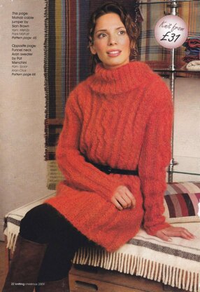 This is a pattern for a Mohair Cable Jumper, originally published in Knitting magazine Christmas 2009 issue. It is a long shape with a central cable pattern and repeated simple cable and ribs, back and sleeves as front. The collar is in rib. The yarn is a soft mohair mix yarn. Photo Lauren Guilfoyle for Knitting magazine.