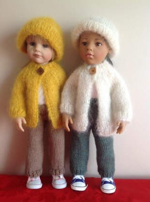 Delightful knitting pattern for 18"/19" girl dolls Mohair Cardigan, pull on Hat and Trousers.