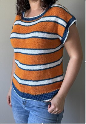 Inspired by daughter’s team colors, the Mojo Tee is an easygoing knit featuring bold stripes, drop shoulder and boxy silhouette. It is perfect for warm weather or layering on cool game days. This pattern combines sporty charm with everyday comfort. Suitable for confident beginners and seasoned knitters alike, the Mojo Tee is a fun, wearable way to celebrate your MVP.