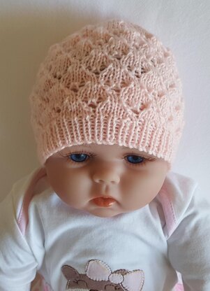 This 4ply baby Beanie has a 1x1 rib band, is worked in a lovely lace stitch then has a stocking stitch crown.