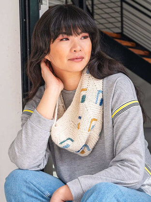 This garter stitch cowl uses mitered squares with just a touch of color for a fresh look. Your finished cowl will be as soft as it is warm and it’s perfect for customizing to your favorite shades.
