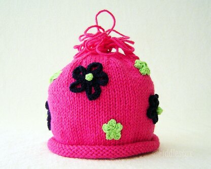 Knit in the round in simple stockinette, the bright flowers are knit separately and sewn on later. The loopy topper is created by wrapping the yarn around your fingers and through the top of the hat.