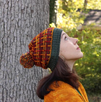 “Mom’s Favorite Color” is a quick, slightly slouchy bottom-up hat that looks more complicated than it is. It uses only one color per row and the plaid effect is created by slipped stitches. The name is a tribute to my mom, who in answer to the age-old question, “What is your favorite color?” always replied, “Plaid.”