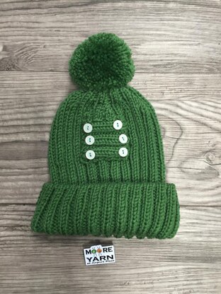 You will need: -200yds worsted weight yarn -US#6-16" circular needles and DPNS -Stitch marker -Tapestry needle -65mm Clover PomPom maker -6 -1/2" buttons -Thread and needle