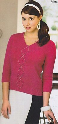 This elegant top has three quarter sleeves and is shaped at the waist and has short row shaping to create bust darts. If you prefer more room at the waist, just omit the waist darts. Apart from the welt and cuff ribbing, this top is worked almost entirely in stocking stitch, the detail relying on the beading on the sleeves and front extending round the neck as an edging. The beads are knitted in, but if you prefer they could be sewn on later – use whichever method you prefer. Since the beads are threaded onto the yarn at the start of the pieces, the top is knitted flat, rather than in the round, to minimise how far the beads are carried along the yarn.