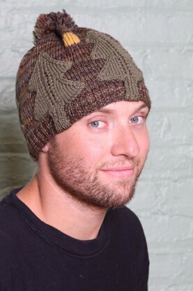 This hat is worked with a variegated background and solid trees (two solid colors can be used). The tree trunks are worked in the rib band and placed on holders, then the trees are picked up and knit separately. After the background is worked (but before the crown shaping), the trees are sewn to the cap. Then the moon is duplicate stitched and the crown shaping is completed.