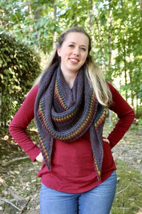 Moonbow is a gorgeous fully-reversible, crescent shaped shawl worked primarily in relaxing garter stitch. The garter stitch is broken up with beautiful multi-color stripes of simple brioche, in the colors of a moonbow, and a single row of WS YOs to add texture and interest. It’s a restful knit that results in a luxurious oversize shawl to wrap out the cold in style.