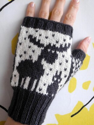 Fingerless mittens with my favourite animals, moose and rabbit. These days, I wear mostly fingerless mittens because it's not too cold around here, and I don't have to take them off for shopping or checking my phone. Knitted in Cheeky merino joy by Rosy green wool, these mittens are soft and warm. Available in two sizes.