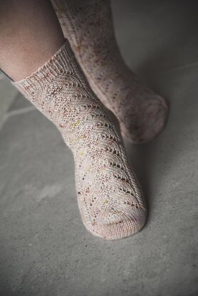 The socks are worked upwards from toe to cuffs. The lace panel is located in the front only, making it easy to knit socks using magic-loop technique. The heels are shaped using w&t short rows. The socks are finished with short ribbed cuffs.