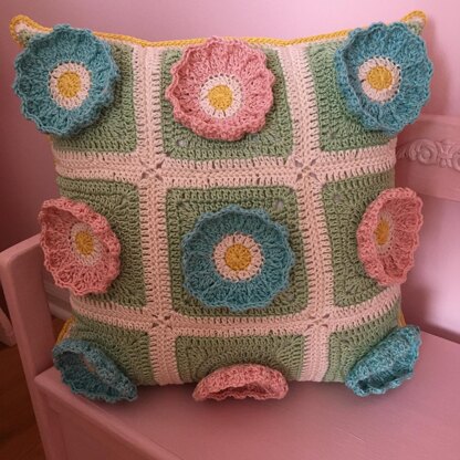 My Morning Glory pillow is made with my granny square from Granny Square Day 2021! I always love seeing everyone’s squares on Granny Square Day. This year, my square was inspired by a morning glory flower. The front of the pillow is composed of nine 3D granny squares, and the back of the pillow is a large light pink granny square. The pillow is joined along three sides, and the bottom is held together with five buttons. This allows the pillow to be taken on and off of the insert. The written pattern includes step by step pictures throughout it. There are round by round pictures and a chart for the granny square. I used Cascade Ultra Pima yarn (219 yd skeins of cotton DK yarn) for the pillow, but any DK weight yarn will work! You will need one skein of each color for the front side, and two skeins of the color of the back side. There will be leftovers of all the colors. You will also need a 18 by 18 in (46 cm) pillow insert and 5 buttons (1.5 cm in diameter).