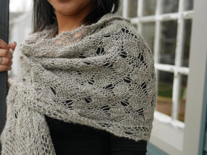 This rectangular wrap is begun at the hem and worked toward the center back. Stole may be shortened to wrap length by working fewer repeats in the morning glories section but taking care to end on the same row as the pattern instructs. Using smaller needles and finer yarn will also produce a smaller piece. Sample gained approximately 30% in length and width when blocked.