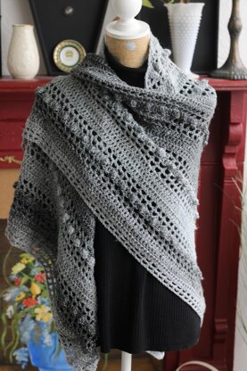This shawl is a fun boho inspired de-sign. A mix of stitches, including bobbles make it a casual piece. The cotton blend of Rise yarn works all year round and for those who cannot wear wool.